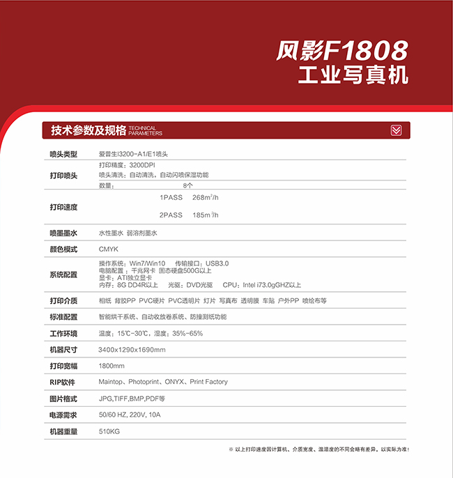 這款設備是世紀風旗下高端機中的工業機型——風影F1808,配備8個愛普生I3200噴頭,生產模式可以達到268㎡/h,戶內戶外廣告訂單皆可輕松完成。