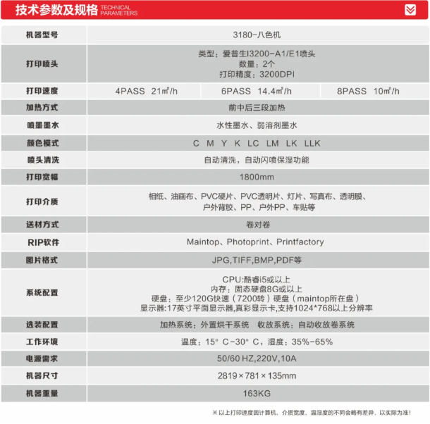 視頻中正在打印的設備正是世紀風旗下2021隆重出品的3180S八色寫真機。該款設備采用愛普生I3200-A1雙噴頭配置,一個噴頭打印深色墨水,一個噴頭打印淺色墨水,打印時速4pass 20㎡/h。