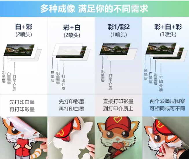 采用分層打印技術(shù),使畫面表面自帶凹凸感,層次分明,支持多種打印模式(彩白彩/白白彩/白彩/彩白/雙彩模式),倍受廣大客戶的親睞。