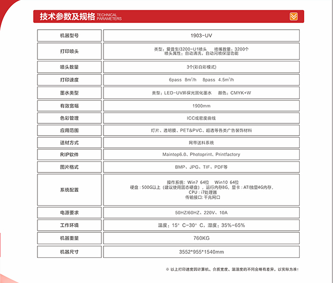 1.9米主流打印寬幅,可以滿足日常對多種打印材料的需求;設(shè)備采用THK靜音直線導(dǎo)軌,工業(yè)化機(jī)身,穩(wěn)定耐用,運行平穩(wěn);畫質(zhì)檢測裝置LED光板,打印過程中檢查畫質(zhì)一目了然;UV燈固化速度快,即打即干,提高工作效率。