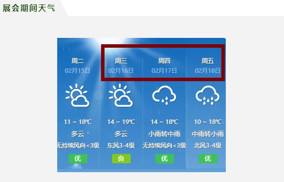 展會期間有陰雨天氣,大家務必要準備好雨具。另外,近日有多個地區迎來虎年首場大范圍降雪降溫天氣,這些地區的朋友一定要做好保暖措施。