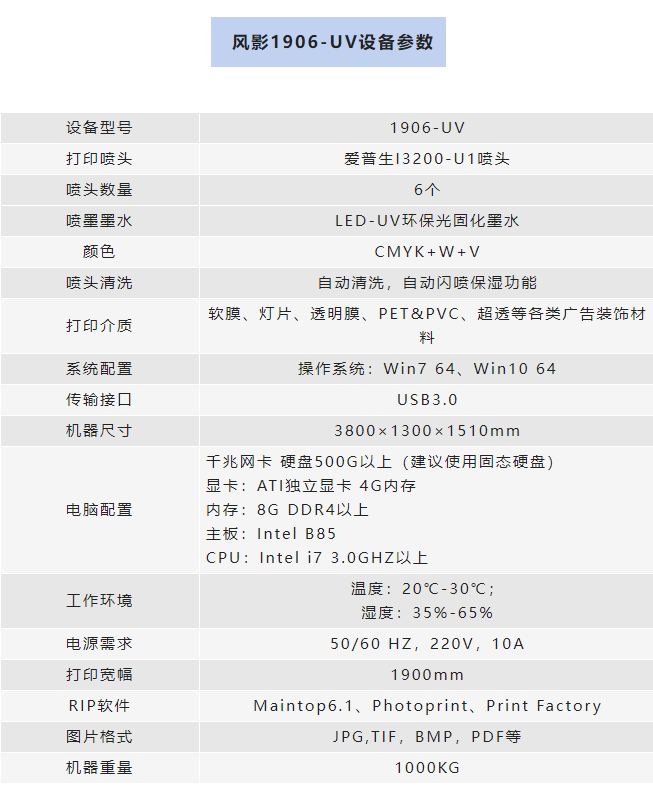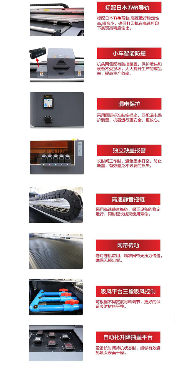 1.9米主流打印寬幅,可以滿足日常對多種打印材料的需求;設備采用THK靜音直線導軌,工業化機身,穩定耐用,運行平穩;畫質檢測裝置LED光板,打印過程中檢查畫質一目了然;UV燈固化速度快,即打即干,提高工作效率。